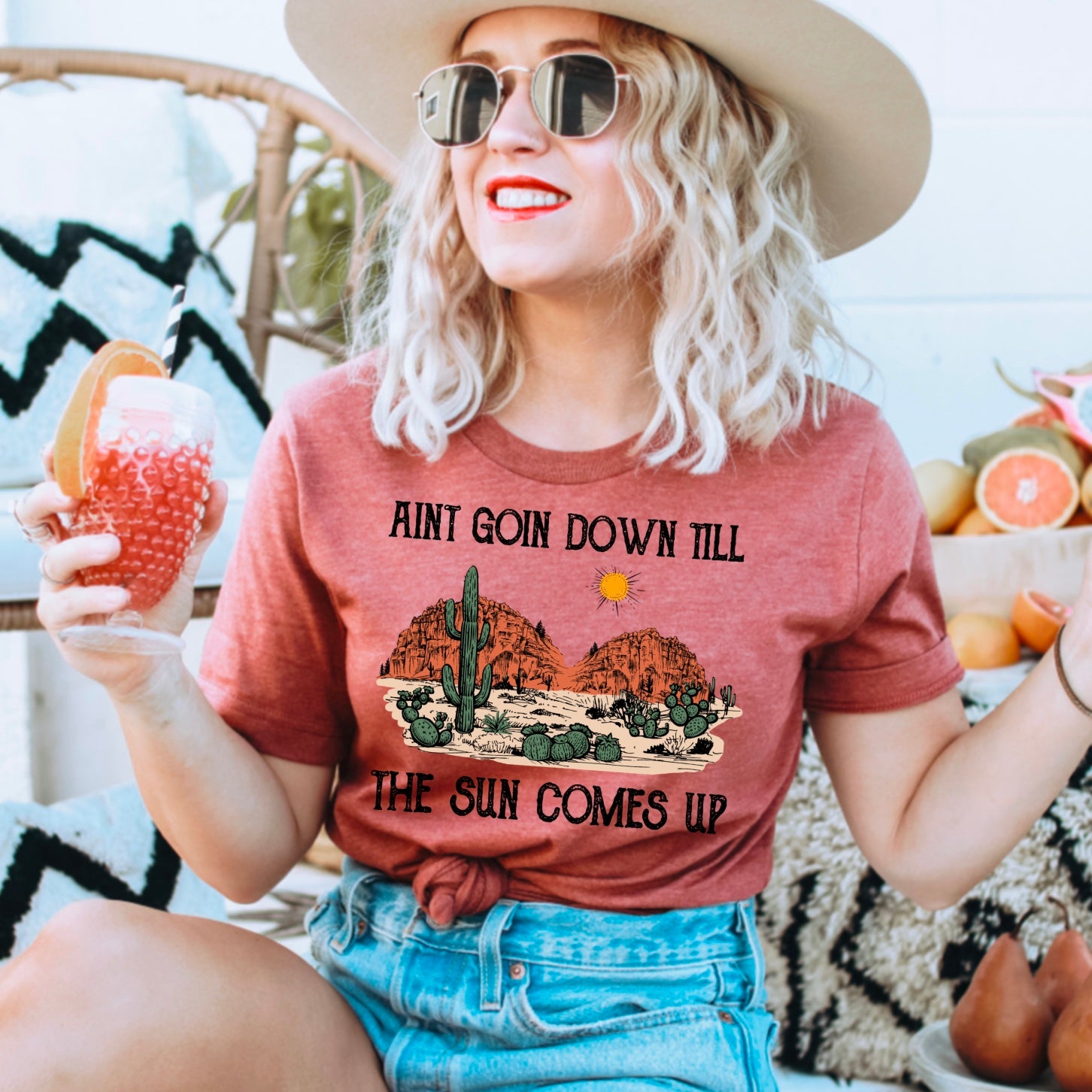 Ain't Going Down 'Til the Sun Comes Up! ☀️🤠 Our shirt captures the unstoppable spirit of never quitting, just like the rising sun. Wear it with determination and seize every day.