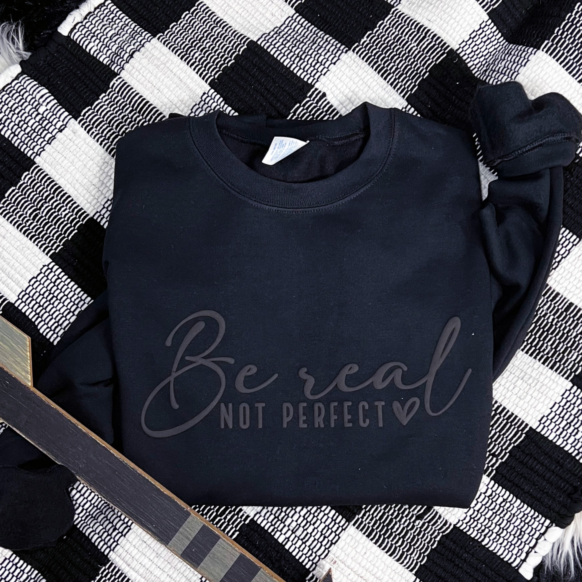 Have you seen those puff designs everywhere that look so cool? We have them available now! This is our be real not perfect design in our dark grey puff!