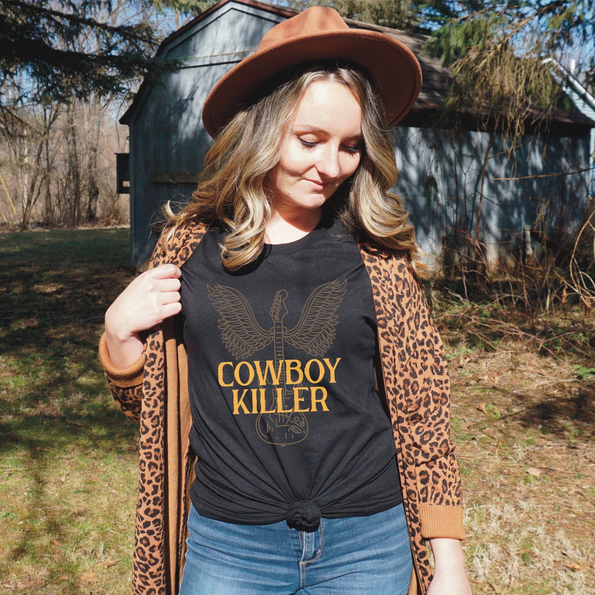 This shirt is for the ultimate country fan! It features a guitar with "Cowboy Killer" written across them. The perfect shirt for those who love country music and rockin' out! Look no further than the Cowboy Killer Guitar Wings T Shirt. This shirt features a vintage-inspired graphic, complete with a guitar and wings. The shirt is made of a soft, lightweight material that will keep you comfortable all day long. Whether you're hitting the town or the open road, this shirt is the perfect addition to your wardrobe.