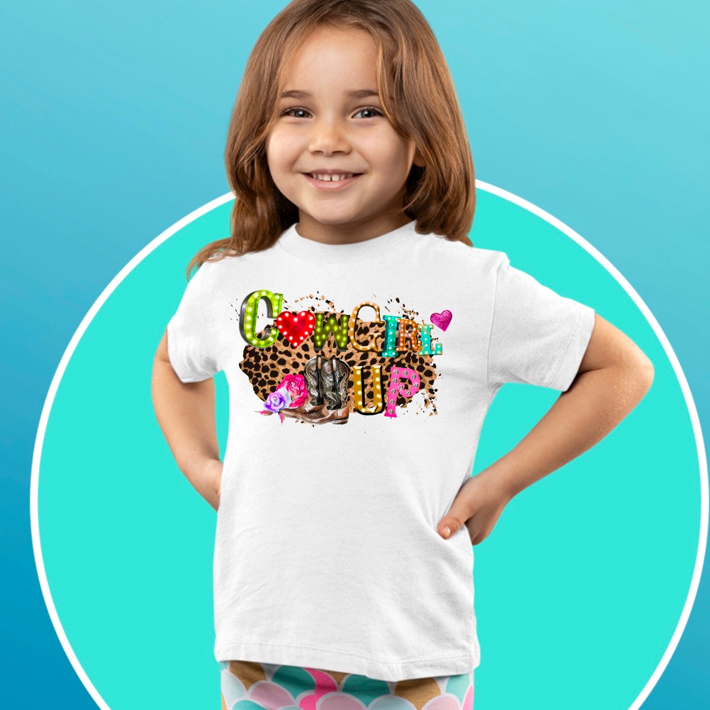 This marquee sign style lettering spelling out "Cowgirl Up" just screams little girl fun! Leopard print and boots to finish off the design, your little lady will love this shirt!