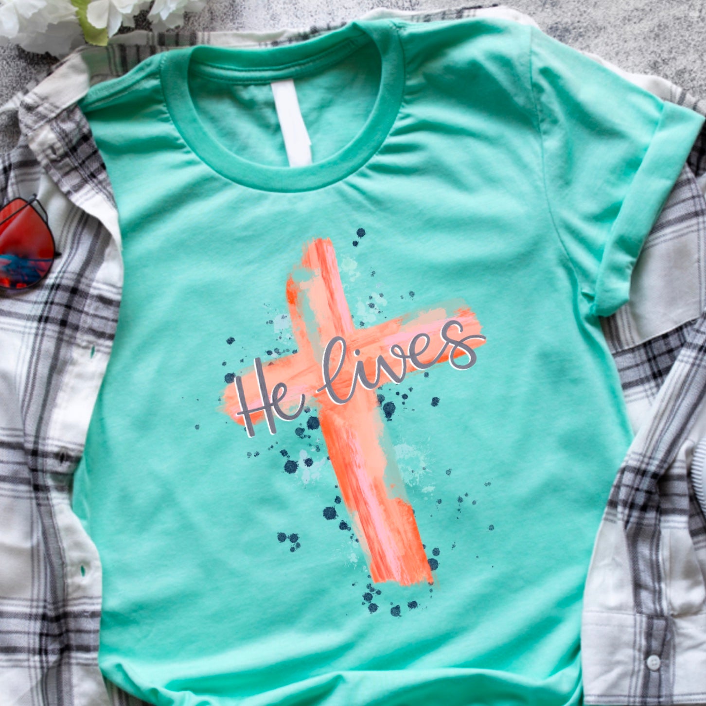 He Lives! This peach colored cross pops on the minty color of the tee!