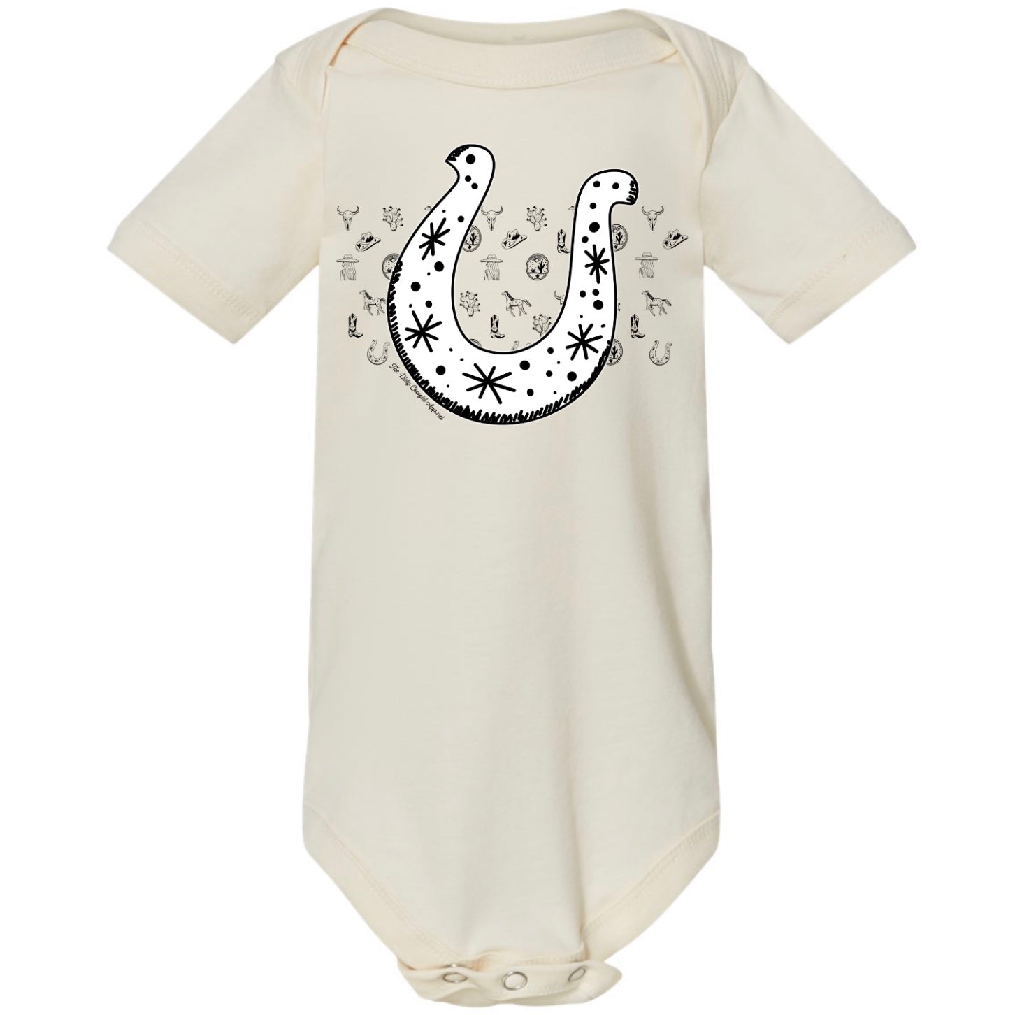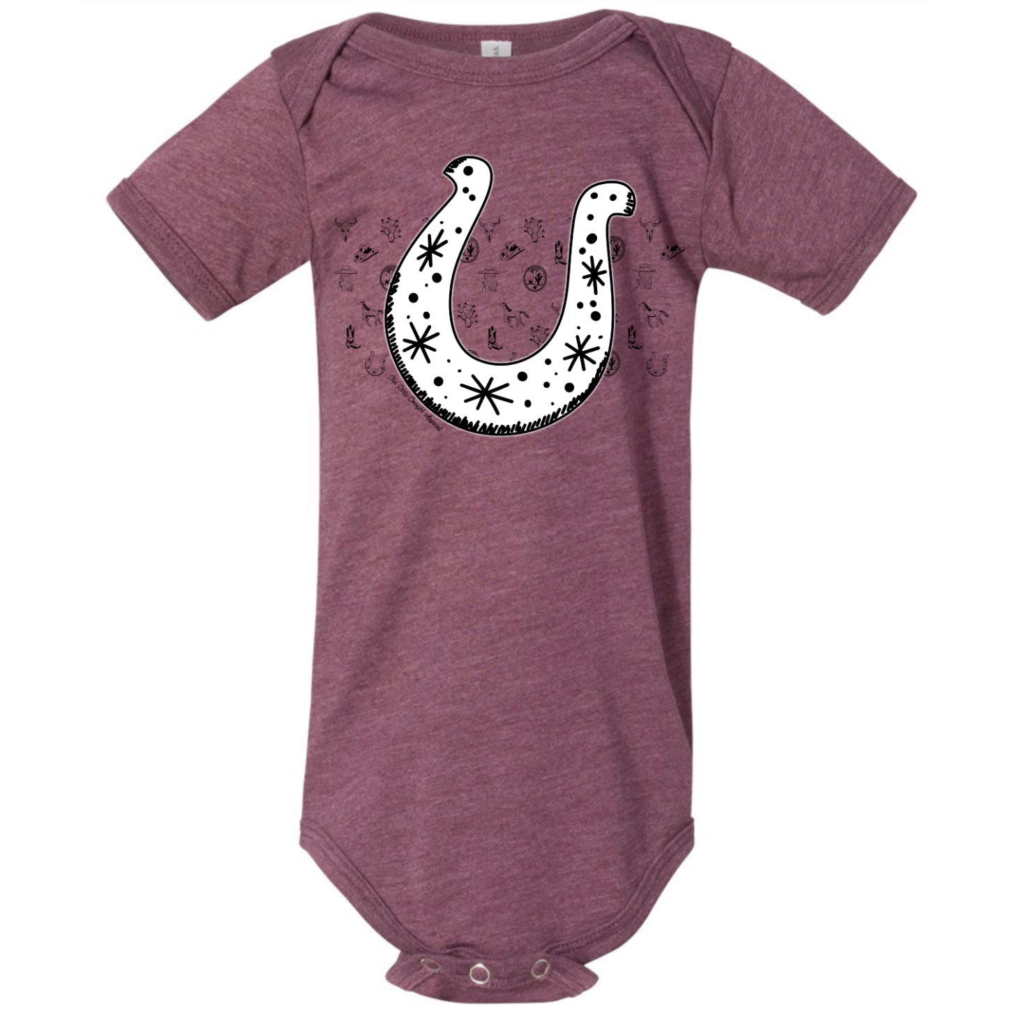 The horse shoe is a symbol of luck and strength in the cowboy world, and your little one will show it off perfectly in this adorable new design!