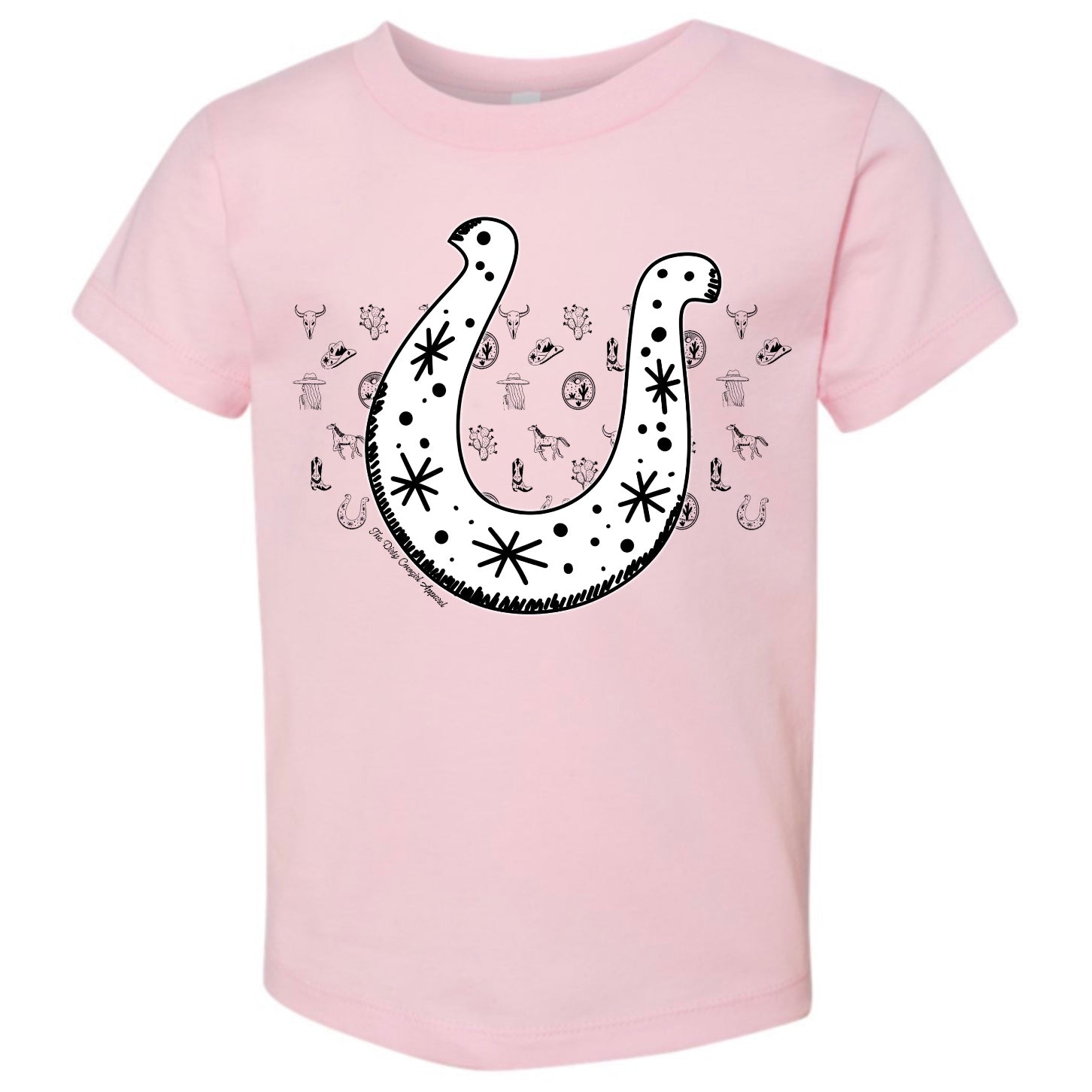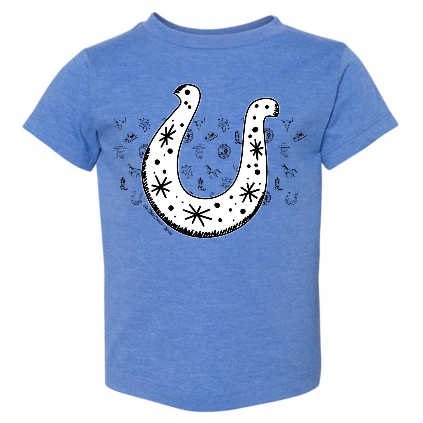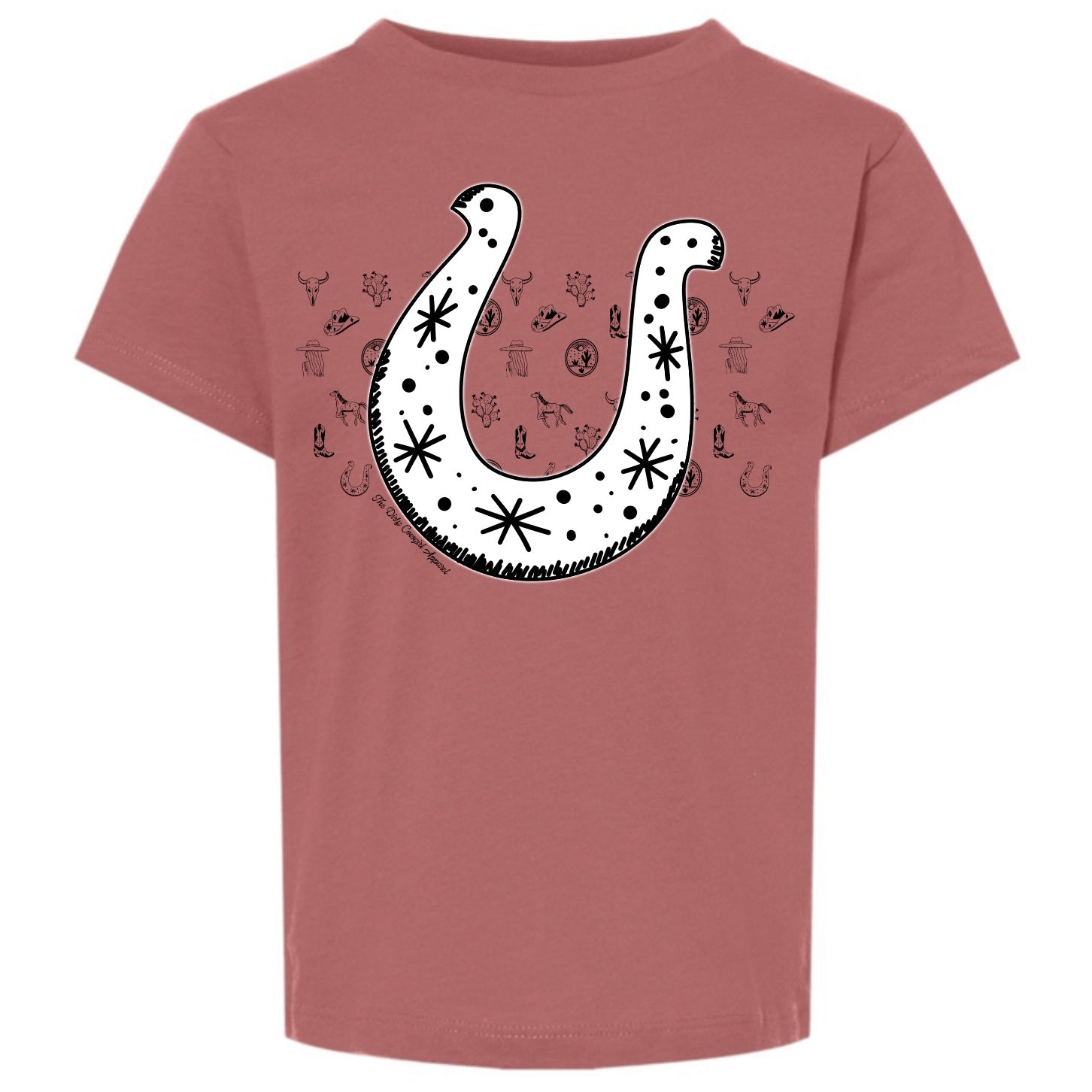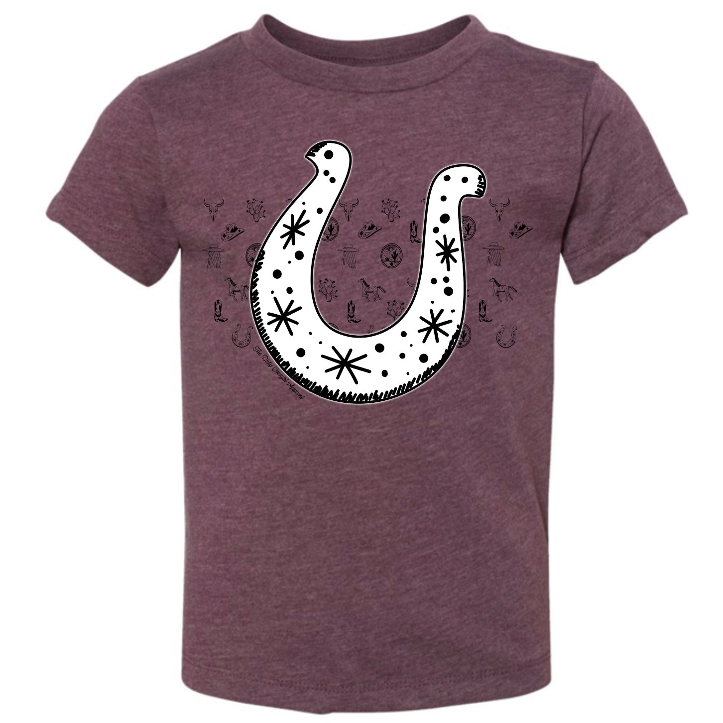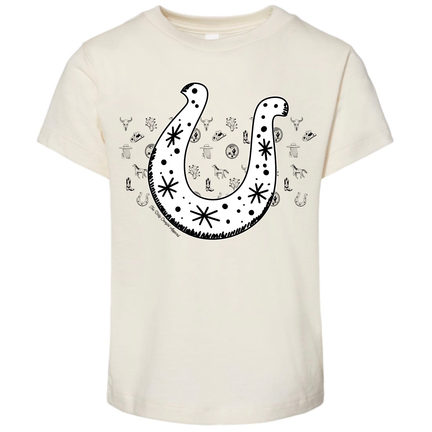 The horse shoe is a symbol of luck and strength in the cowboy world, and your little one will show it off perfectly in this adorable new design!
