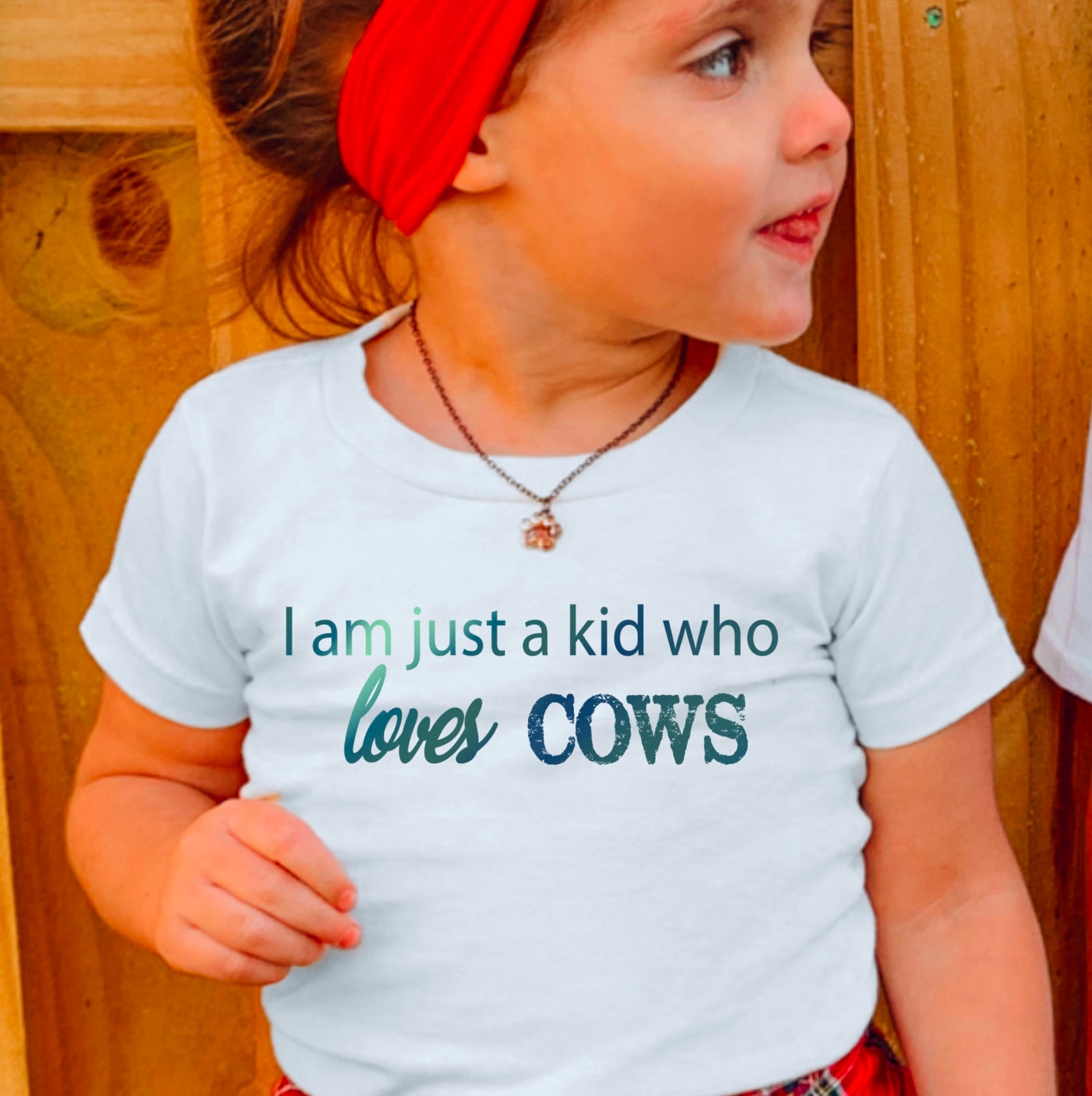 This water-colored blue and green writing just pops again a white toddler tee! And from a kid from the farm, who loves cows.. I'm sure you're kiddo who loves cows - will love this design too!