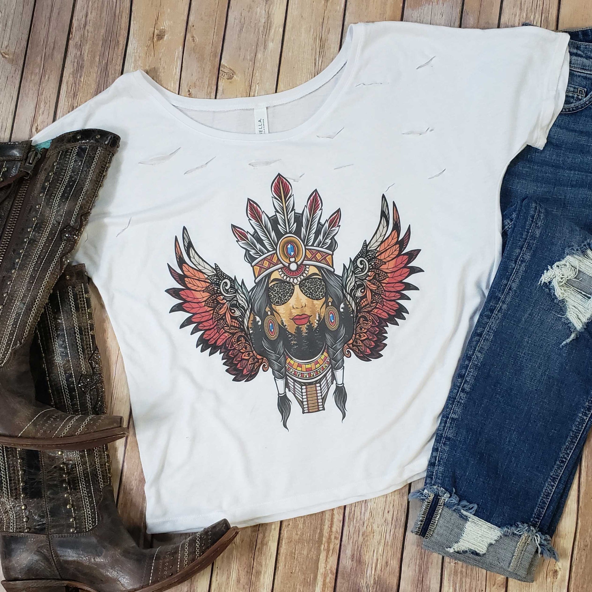 Distressed scoop neckline! If you size up, you can wear off one shoulder easy!