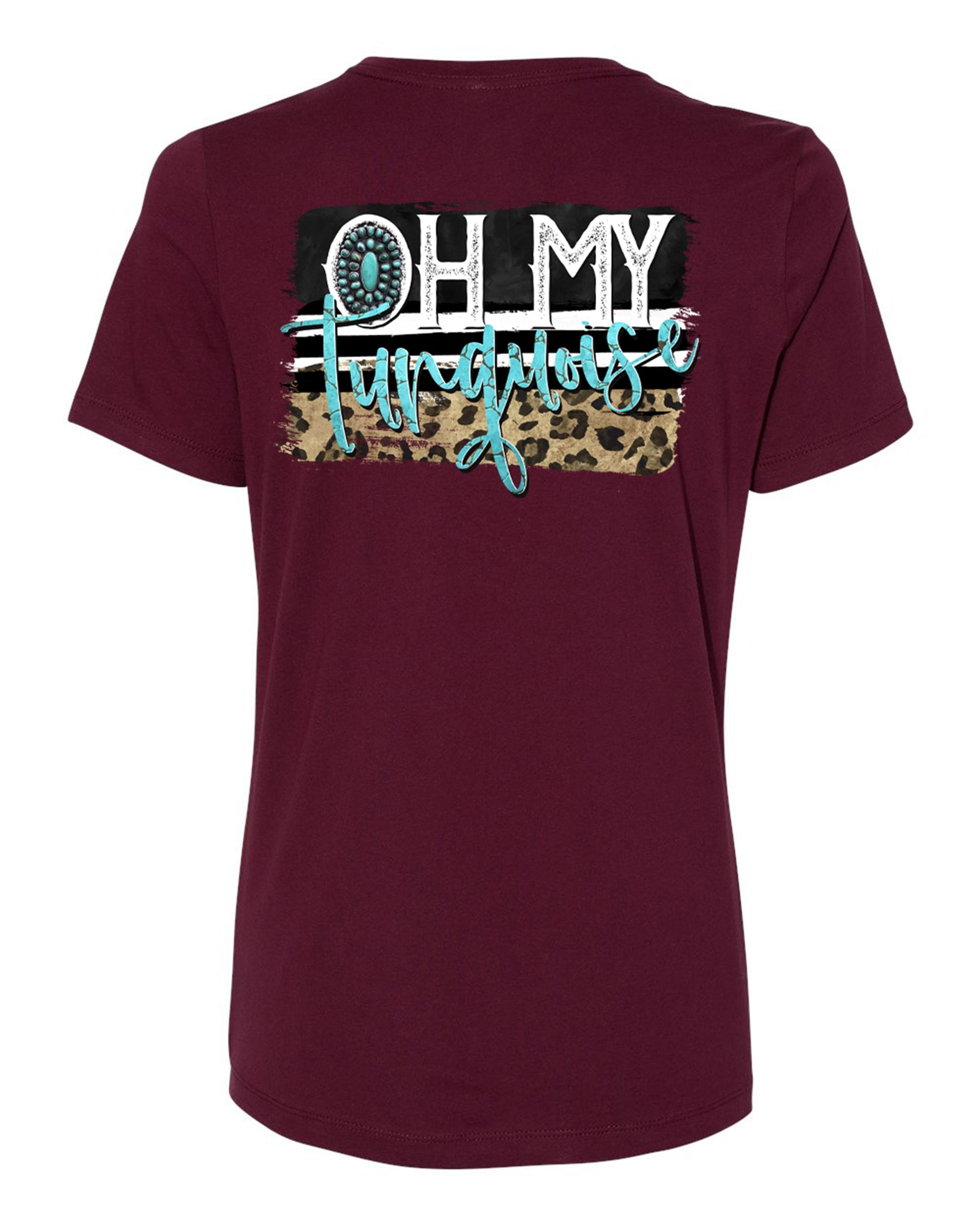 To all Turquoise lovin country girls! This is the perfect shirt for you. If you just can't help but break out your turquoise for every occasion this has you covered. It has the touch of fierce cheeta print and the design just bounces right of the gorgeous maroon tee.