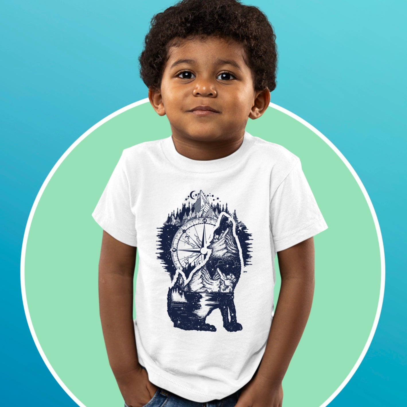 This super cool new design is perfect for that little adventurer! A wilderness landscape scene in the outline of the wolf, with mountains topping the compass in the background!
